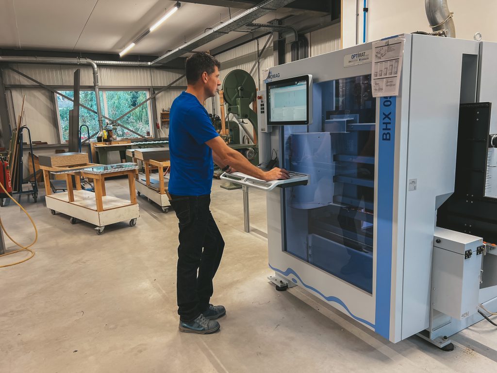 De hand van de meester mag nog zo vaardig zijn, als het bij zagen, frezen en boren op precisie aankomt gaat er niets boven computergestuurd werken. Onze CNC (Computer Numerical Control) bewerkingsmachine stelt ons in staat perfectie te leveren tot een fractie van een millimeter.
